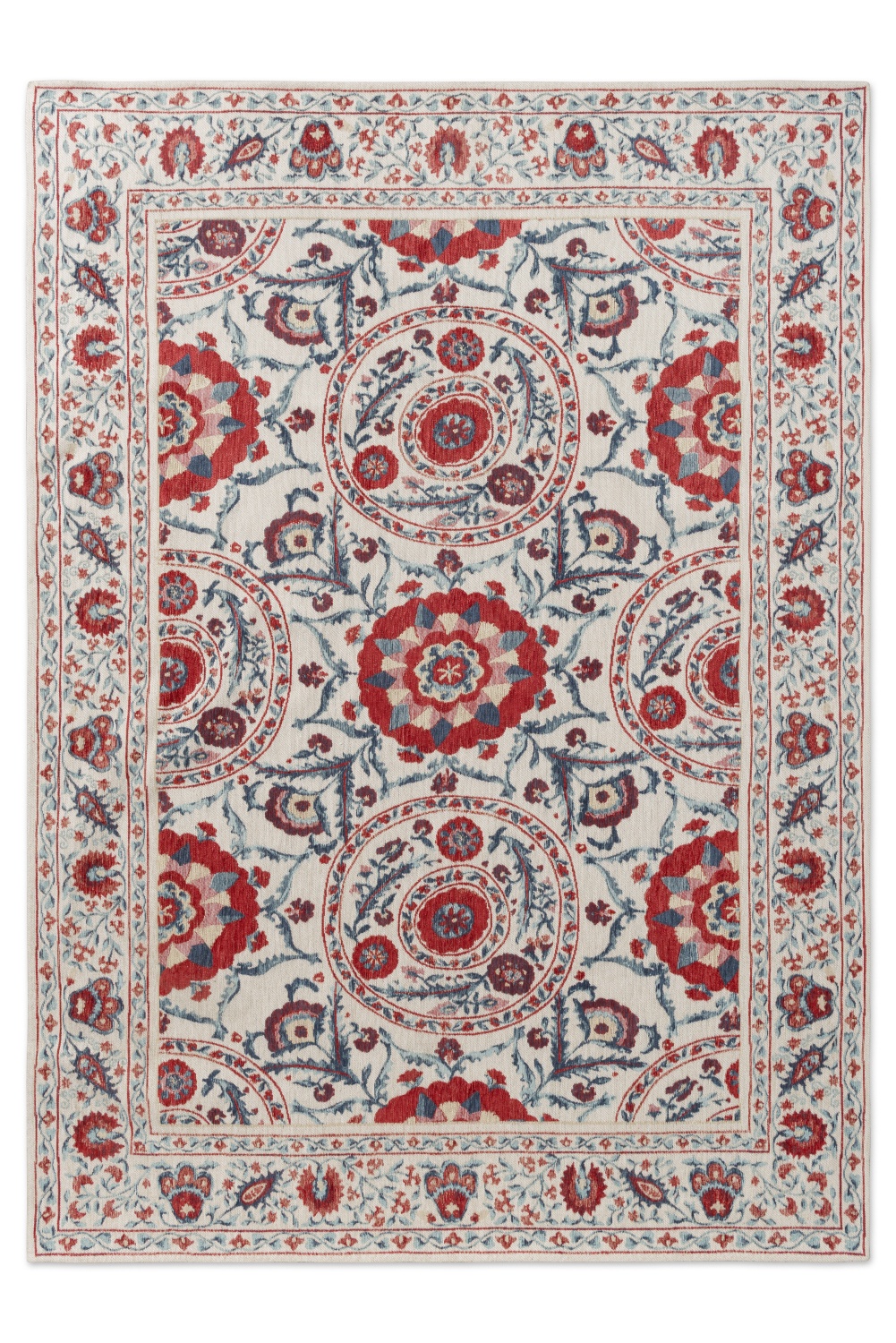 Designový koberec Sanderson Anthos Red & Indigo přináší do interiéru bohatě zdobený vzor inspirovaný tradičním uzbeckým suzani textilním uměním, který je moderně reinterpretován v podobě žakárově tkaného dekorativního koberce. Tento elegantní motiv vytváří výrazný vizuální akcent, který skvěle doplní obývací pokoj, ložnici či kancelář a vnese do prostoru atmosféru kultivované elegance a osobitého stylu. Koberec je vyroben z kvalitní kombinace 70 % PET vláken a 30 % vlny, což mu dává dlouhou životnost, snadnou údržbu a příjemný pocit pod nohama. Po tkaní žakárovou technikou je vlákno rovnoměrně rozloženo a vzor působí hluboce a precizně. Díky kombinaci materiálů je koberec zároveň odolný proti opotřebení i v mírně frekventovaných prostorách. Designové provedení v teplých červených a indigo odstínech dodává prostoru energii i sofistikovanost a propojuje moderní styl s klasickými prvky. Koberec se stane stylovým doplňkem každého interiéru – od minimalistického a moderního až po klasicky laděný styl s výraznými akcenty. Kvalita koberce je 1500 g/m2 , výška vlasu 3 mm. Koberec je vhodný i pro podlahové vytápění. Tolerance velikosti dodávaných koberců je +/- 5%. Tento text je chráněn autorským právem, právem na ochranu v hospodářské soutěži a trestním právem. E-color.cz