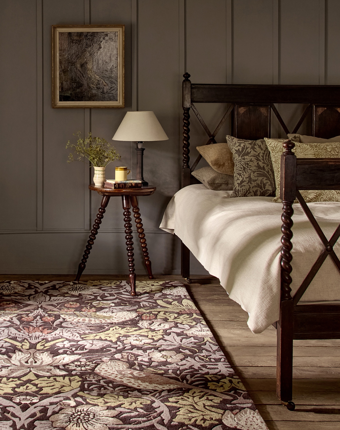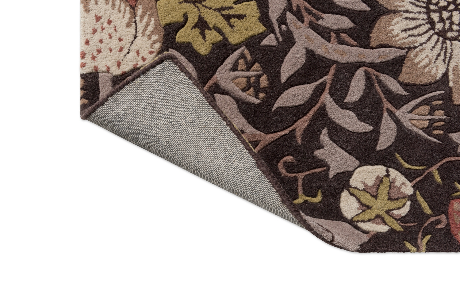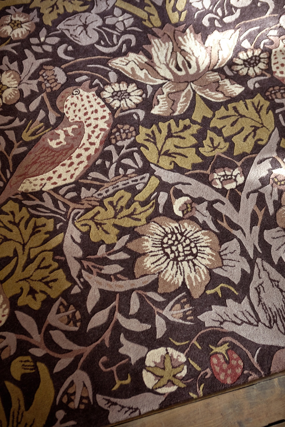 Designový koberec Morris & Co Strawberry Thief Grape přináší do interiéru ikonický vzor inspirovaný historickým designem Williama Morrise, který vznikl v roce 1883 a je považován za jeden z jeho nejznámějších motivů. Motiv znázorňuje ptáky (drozdovité) pochytávající jahody mezi bohatou florou, což dodává koberci jedinečný příběh a vizuální hloubku.