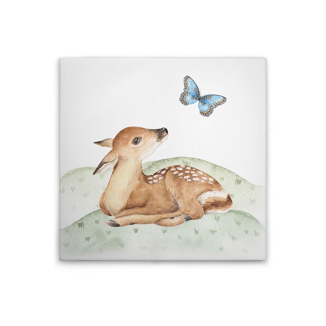 Dětský obraz Lilly & Luis – motiv srnky s motýlem přináší do dětského pokoje barevnou, hravou a přírodní atmosféru. Tento kvalitní obraz na plátně o rozměru 30x30cm a 40x40 cm je vyroben z odolného materiálu a je ideální pro dekoraci stěny v dětském pokoji, herně nebo školce.